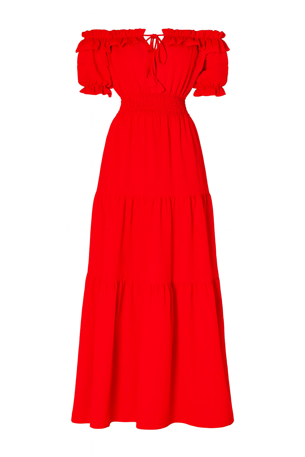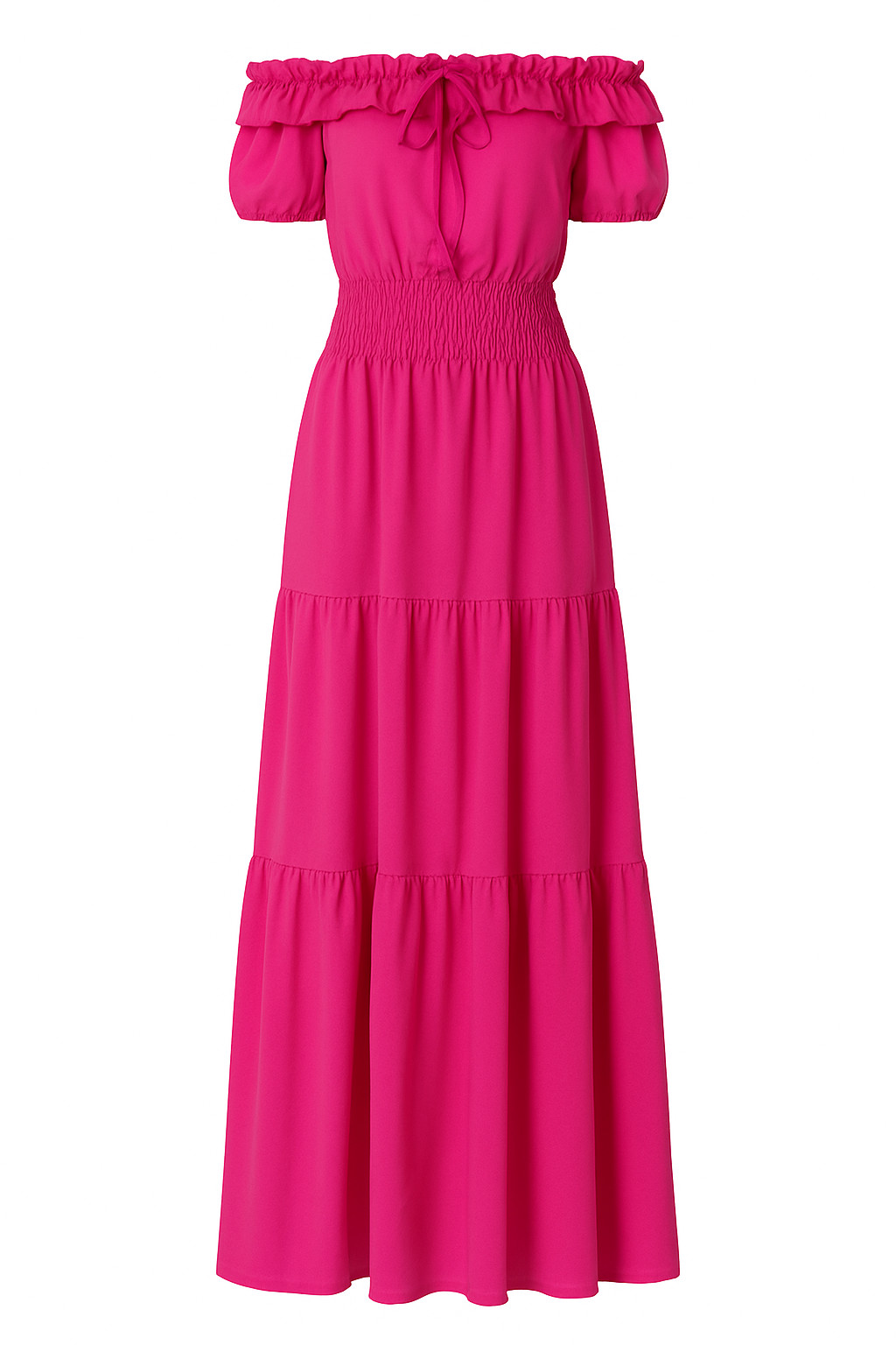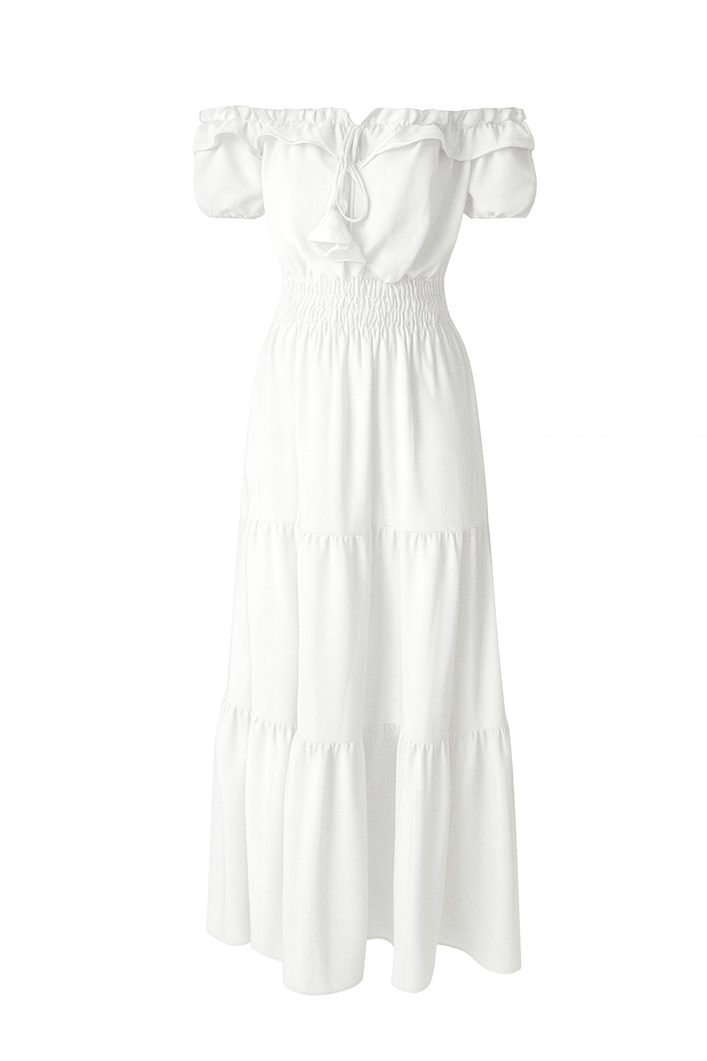 Vestido de verano de manga abullonada con cuello de tubo y borde de hoja de loto de color liso.